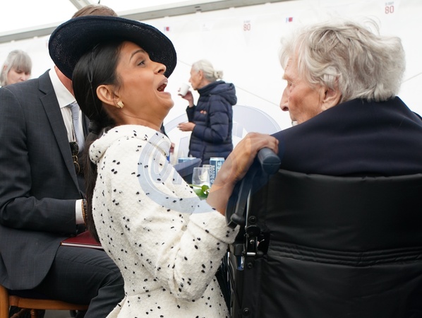 Akshata Murty speaks with D-Day veteran Christian Lamb, who was presented earlier with the Legion d'Honneur, during a lunch following the UK national commemorative event for the 80th anniversary of D-Day, held at the British Normandy Memorial in Ver-sur-Mer, Normandy, France. Picture date: Thursday June 6, 2024. It is the first time the memorial, which contains the names of the 22,442 servicemen and women under British command who fell on D-Day and during the Battle of Normandy in the summer of 1944, has been used for major anniversary commemorations, after having been opened in 2021. NO UK USE FOR 48 HOURS, Credit:Avalon.red / Avalon