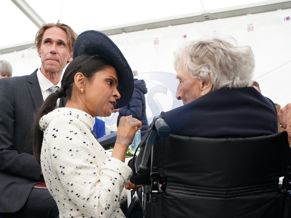 Akshata Murty speaks with D-Day veteran Christian Lamb, who was presented earlier with the Legion d'Honneur, during a lunch following the UK national commemorative event for the 80th anniversary of D-Day, held at the British Normandy Memorial in Ver-sur-Mer, Normandy, France. Picture date: Thursday June 6, 2024. It is the first time the memorial, which contains the names of the 22,442 servicemen and women under British command who fell on D-Day and during the Battle of Normandy in the summer of 1944, has been used for major anniversary commemorations, after having been opened in 2021. NO UK USE FOR 48 HOURS, Credit:Avalon.red / Avalon