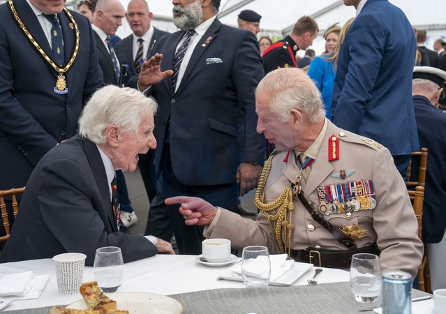 The King and Queen met the veterans at the UK National Commemorative Event to mark the 80th Anniversary of the Normandy Landings at Ver-Sur-Mer The King with veteran Peter Newton, Credit:Arthur Edwards / Avalon