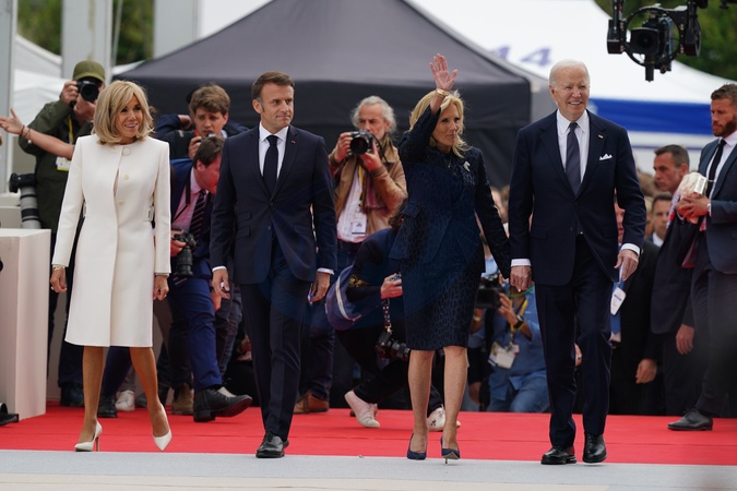 US President Joe Biden and first lady Jill Biden (right), arrive with French President Emmanuel Macron and his wife Brigitte, at the official international ceremony to mark the 80th anniversary of D-Day, at Omaha Beach in Saint-Laurent-sur-Mer, Normandy, France, joining over 25 heads of state and veterans from around the world., Credit:Jordan Pettitt / Avalon