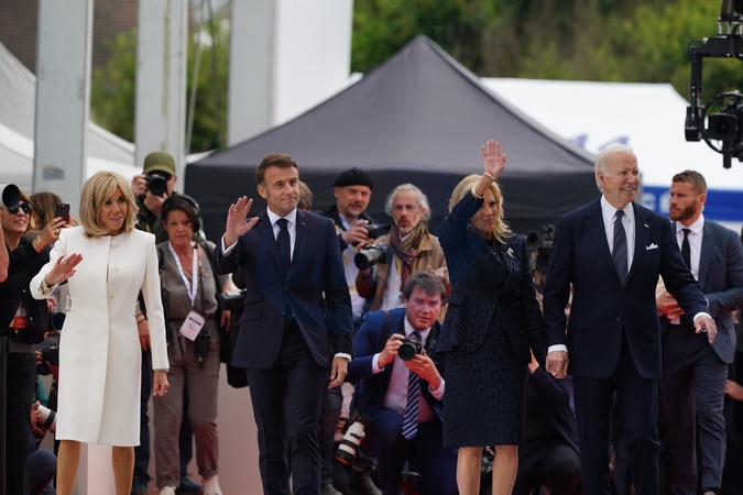 US President Joe Biden and first lady Jill Biden (right), arrive with French President Emmanuel Macron and his wife Brigitte, at the official international ceremony to mark the 80th anniversary of D-Day, at Omaha Beach in Saint-Laurent-sur-Mer, Normandy, France, joining over 25 heads of state and veterans from around the world., Credit:Jordan Pettitt / Avalon
