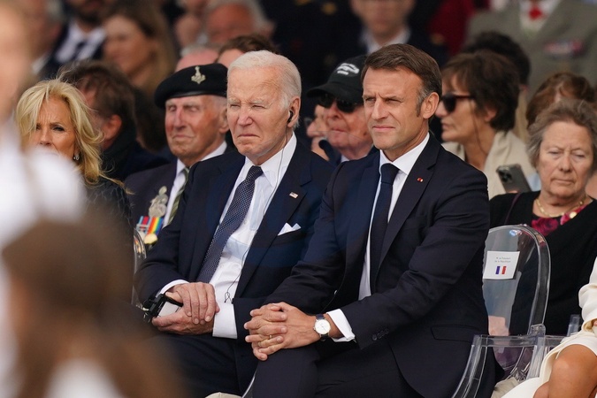 US President Joe Biden sits with French President Emmanuel Macron (right), at the official international ceremony to mark the 80th anniversary of D-Day, at Omaha Beach in Saint-Laurent-sur-Mer, Normandy, France, joining over 25 heads of state and veterans from around the world., Credit:Jordan Pettitt / Avalon