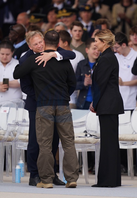 Defence Secretary Grant Shapps (left) greets Ukrainian President Volodymyr Zelensky and his wife Olena Zelenska arrives at the official international ceremony to mark the 80th anniversary of D-Day, at Omaha Beach in Saint-Laurent-sur-Mer, Normandy, France, joining over 25 heads of state and veterans from around the world., Credit:Jordan Pettitt / Avalon