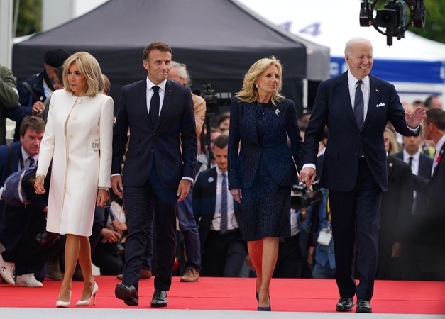 The President of France Emmanuel Macron and his wife Brigitte Macron (left) with US President Joe Biden and first lady Jill Biden arrive at the official international ceremony to mark the 80th anniversary of D-Day, at Omaha Beach in Saint-Laurent-sur-Mer, Normandy, France, joining over 25 heads of state and veterans from around the world., Credit:Jordan Pettitt / Avalon