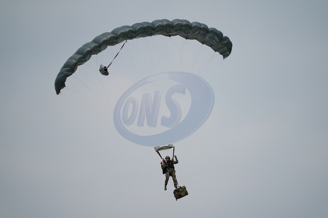 A parachutist during the official international ceremony to mark the 80th anniversary of D-Day, at Omaha Beach in Saint-Laurent-sur-Mer, Normandy, France, joining over 25 heads of state and veterans from around the world., Credit:Jordan Pettitt / Avalon
