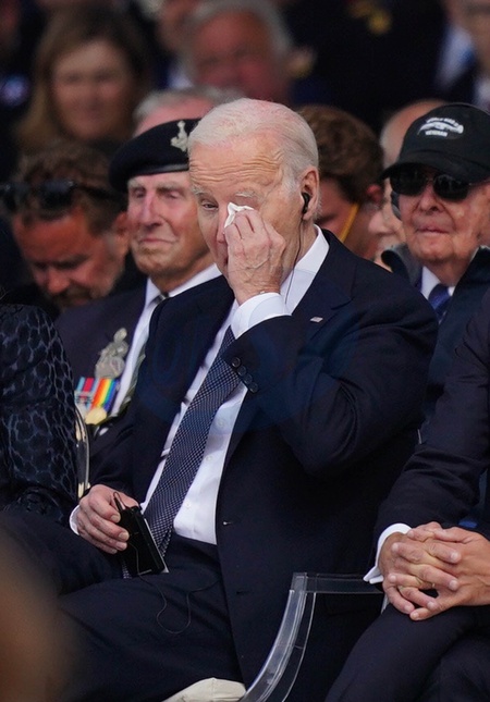 US President Joe Biden wipes his eye during the official international ceremony to mark the 80th anniversary of D-Day, at Omaha Beach in Saint-Laurent-sur-Mer, Normandy, France, joining over 25 heads of state and veterans from around the world., Credit:Jordan Pettitt / Avalon
