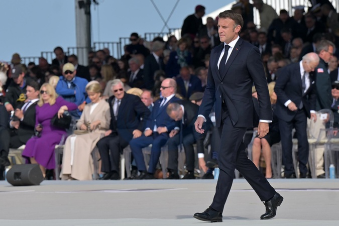 France's President Emmanuel Macron walks to the podium to deliver a speech during the International commemorative ceremony at Omaha Beach marking the 80th anniversary of the World War II "D-Day" Allied landings in Normandy, in Saint-Laurent-sur-Mer, in northwestern France, on June 6, 2024. The D-Day ceremonies on June 6 this year mark the 80th anniversary since the launch of 'Operation Overlord', a vast military operation by Allied forces in Normandy, which turned the tide of World War II, eventually leading to the liberation of occupied France and the end of the war against Nazi Germany., Credit:LOU BENOIST / Avalon