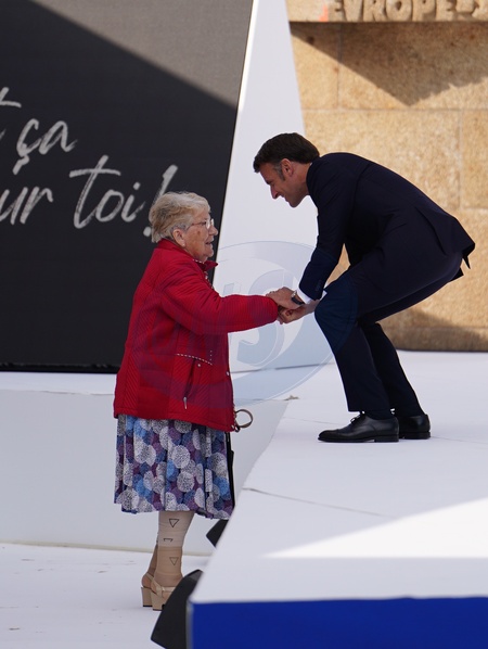 A lady speaks to French President Emmanuel Macron, at the official international ceremony to mark the 80th anniversary of D-Day, at Omaha Beach in Saint-Laurent-sur-Mer, Normandy, France, joining over 25 heads of state and veterans from around the world., Credit:Jordan Pettitt / Avalon