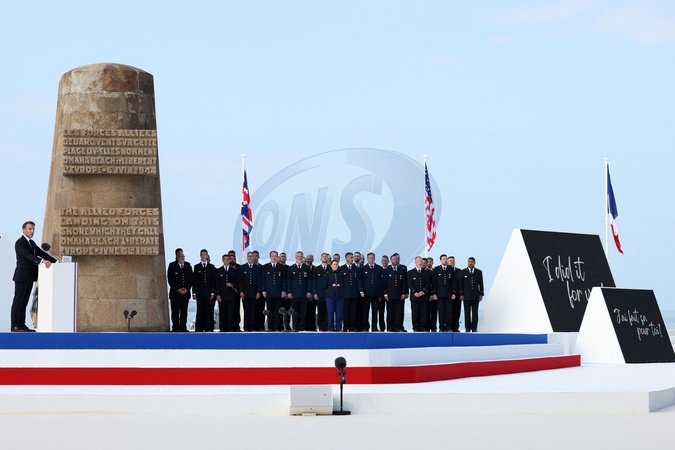 Le président Emmanuel Macron lors de la cérémonie internationale d'Omaha Beach dans le cadre de la commémoration du 80ème anniversaire du débarquement en Normandie (D-Day)
