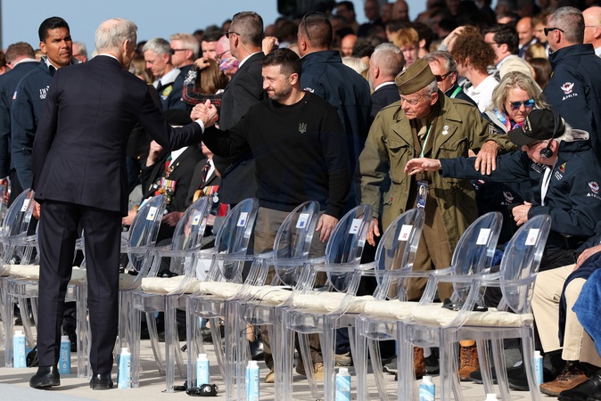 Le président Joe Biden, Le président de l'Ukraine, Volodymyr Zelensky lors de la cérémonie internationale d'Omaha Beach dans le cadre de la commémoration du 80ème anniversaire du débarquement en Normandie (D-Day) le 6 juin 2024. © Stéphane Lemouton / Bestimage Omaha Beach international ceremony as part of the commemoration of the 80th anniversary of the Normandy landings (D-Day) on 6 June 2024.