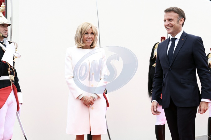 Le président Emmanuel Macron et sa femme Brigitte Macron accueillent les invités de la cérémonie internationale d'Omaha Beach dans le cadre de la commémoration du 80ème anniversaire du débarquement en Normandie (D-Day)