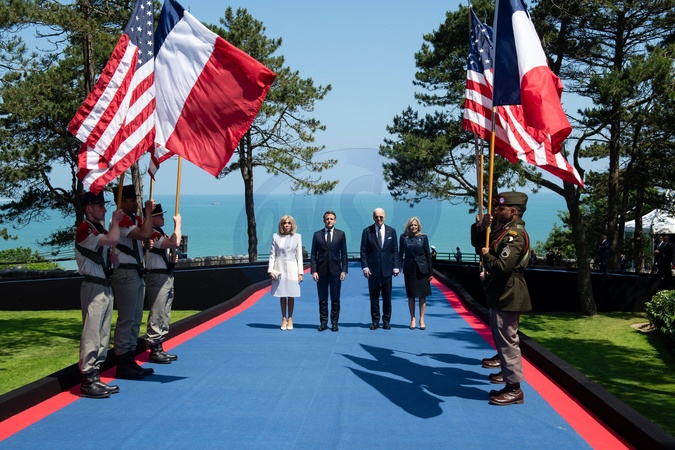 Cérémonie Franco-américaine au cimetière américain de Colleville sur Mer dans le cadre de la commémoration du 80ème anniversaire du débarquement en Normandie (D-Day) le 6 juin 2024. © Jeanne Accorsini / Pool / Bestimage Brigitte Macron, first lady of France and wife of Emmanuel Macron, president of French republic, Joe Biden president of the United states and his wife Jill Bien. Commemoration at Normandy American Cemetery marks the 80th anniversary of D-Day landings along the Normandy coast during the World War II. This event ultimately led to the liberation of Europe. Thursday June 6, 2024, Colleville-sur-mer, Normandy, France.//ACCORSINIJEANNE_COLLEVILLE.005/Credit:JEANNE ACCORSINI/SIPA/2406070033
