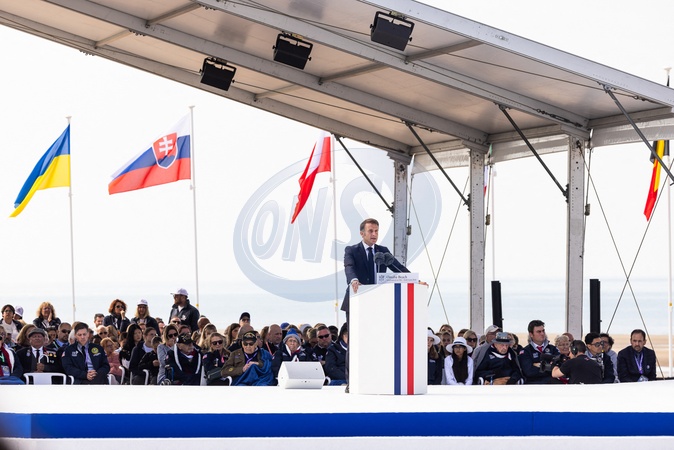 Le président Emmanuel Macron - Le président de l'Ukraine lors de la cérémonie internationale d'Omaha Beach pour la commémoration du 80ème anniversaire du débarquement (D-Day) le 6 juin 2024. © Ukraine Presidency via Bestimage The President of Ukraine at the Omaha Beach international ceremony to commemorate the 80th anniversary of D-Day on 6 June 2024.