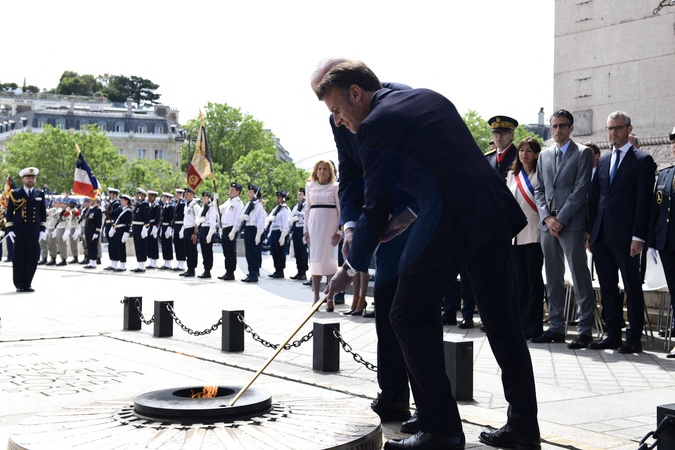 Joe Biden i Emmanuel Macron podczas ceremonii pod Łukiem Triumfalnym z okazji oficjalnej podróży Prezydenta Stanów Zjednoczonych do Francji