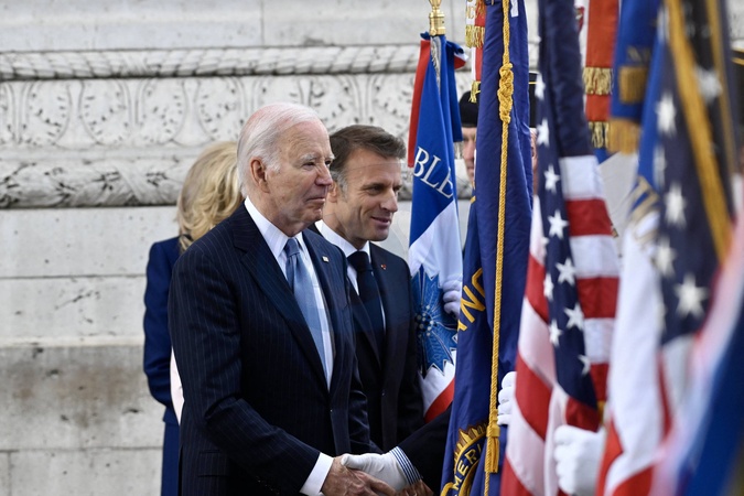 Emmanuel Macron et Joe Biden - Cérémonie à l'Arc de Triomphe à Paris, à l'occasion du voyage officiel du président des Etats-Unis en France. Le 8 juin 2024 © Jeanne Accorsini / Pool / Bestimage Ceremony at the Arc de Triomphe in Paris, on the occasion of the official trip of the President of the United States to France. On June 8, 2024