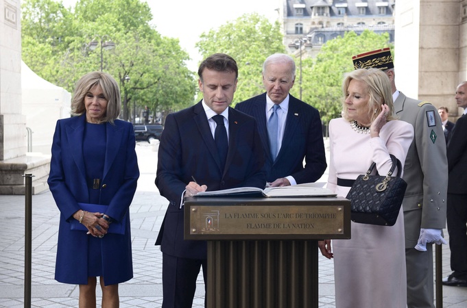 Joe Biden i Emmanuel Macron podczas ceremonii pod Łukiem Triumfalnym z okazji oficjalnej podróży Prezydenta Stanów Zjednoczonych do Francji