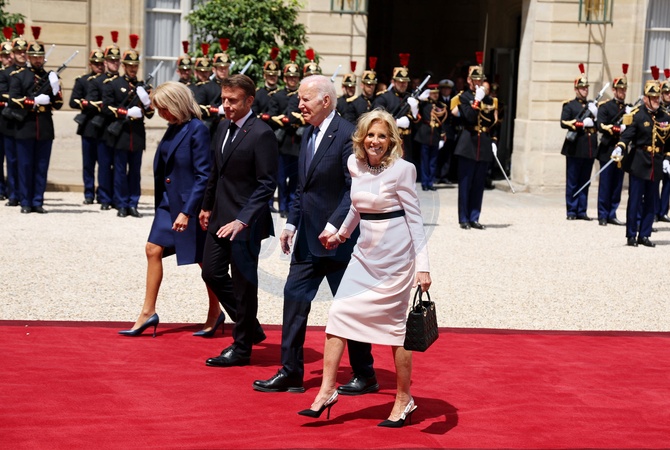 Joe Biden i jego żona Jill po przybyciu do Pałacu Elizejskiego w Paryżu z okazji wizyty państwowej we Francji