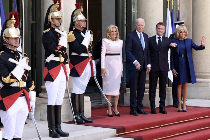 Le président français Emmanuel Macron et la première dame, Brigitte Macron accueillent le président américain Joe Biden et sa femme Jill Biden au palais de l'Elysee pour une visite d'état. Le 8 juin 2024. © Stéphane Lemouton / Bestimage The President of the United States and his wife arrive at the Elysée Palace in Paris on their state visit to France. June 8, 2024