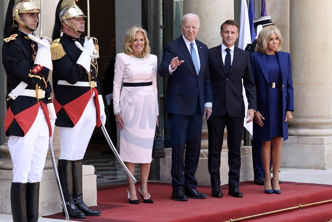 Le président français Emmanuel Macron et la première dame, Brigitte Macron accueillent le président américain Joe Biden et sa femme Jill Biden au palais de l'Elysee pour une visite d'état. Le 8 juin 2024. © Stéphane Lemouton / Bestimage The President of the United States and his wife arrive at the Elysée Palace in Paris on their state visit to France. June 8, 2024