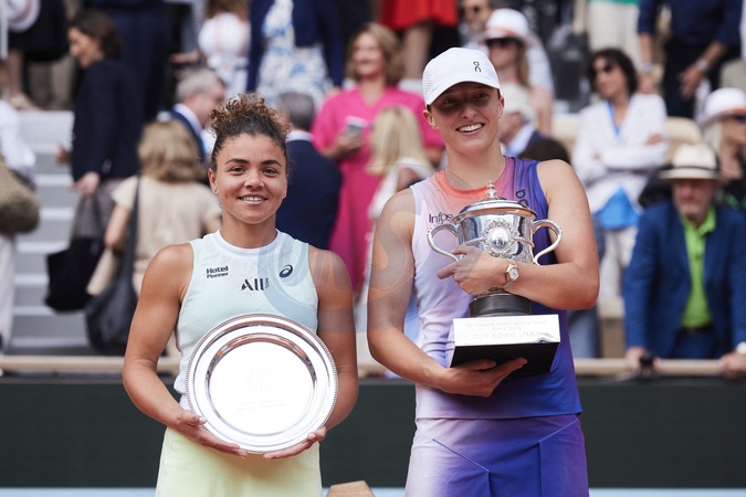 Jasmine Paolini, Iga Swiatek - Remise du trophée à Iga Swiatek à l'issue de la finale Dames des Internationaux de Tennis de Roland Garros à Paris. Le 8 juin 2024 © Moreau-Jacovides / Bestimage Presentation of the trophy to Iga Swiatek at the end of the Ladies' final of the Roland Garros International Tennis Championships in Paris. On June 8, 2024