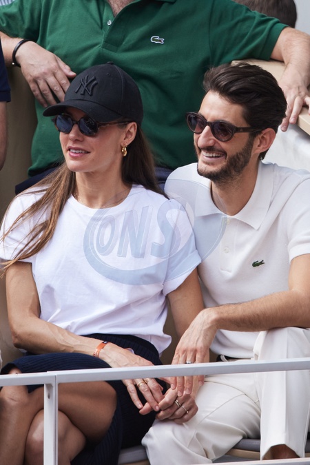 Pierre Niney et sa compagne Natasha Andrews - Célébrités dans les tribunes de la finale homme des Internationaux de France de tennis de Roland Garros 2024 à Paris le 9 juin 2024. © Jacovides-Moreau/Bestimage Celebrities in the stands of the men's final of the French Open tennis tournament at Roland Garros 2024 in Paris on June 9, 2024