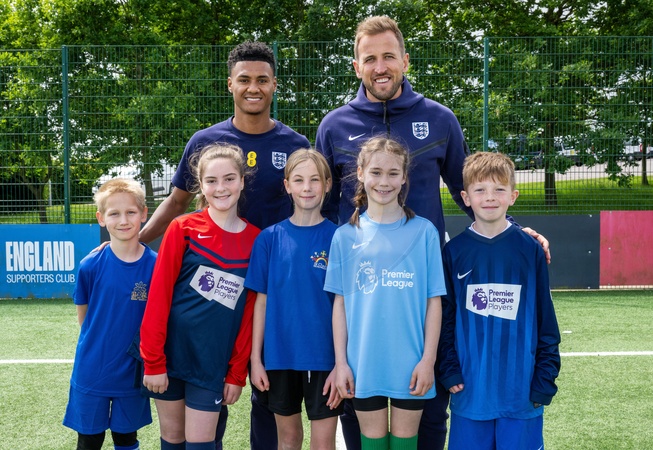 PRINCE WILLIAM VISITS THE ENGLAND CAMP AT ST GEORGES THE NEGLAND SQUAD GATHER ROUND TO LISTEN TO THE PRINCE SPEAK,THE SHIRT IS PRESENTED TO HARRY KANE, THE PRINCE ENJOYS A ST GEORGES COFFEE, THEN VISITS THE YOPUNG CHILDREMN ALONG WITH HARRY KANE PHOTO PAUL COOPER, Credit:Avalon