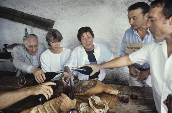 ( Info : Françoise Hardy est morte à 80 ans) - Info - Jacques Dutronc fête ses 80 ans le 28 avril - Archives - No Web - En France, en Corse, à l'Ile Rousse, chez lui, Jacques Dutronc avec sa mère et son père, avec sa compagne Françoise Hardy, tous réunis autour d'une table avec Jean Fusil (un ami) et des copains corses pour déjeuner le 9 août 1984.