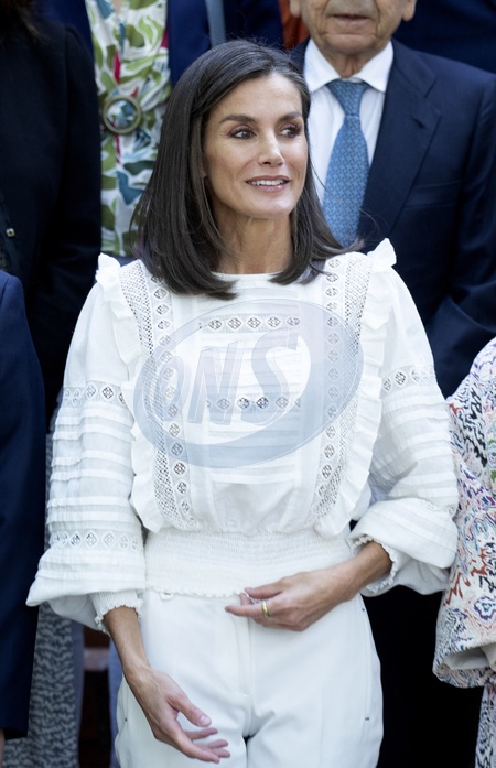 La reine Letizia préside la réunion du conseil d'administration de la Residencia de Estudiantes à Madrid, le 12 juin 2024. Queen Letizia, wearing full white outfit, visits the tradicional Residencia de Estudiantes (Students Residence), Madrid. June 12th, 2024.