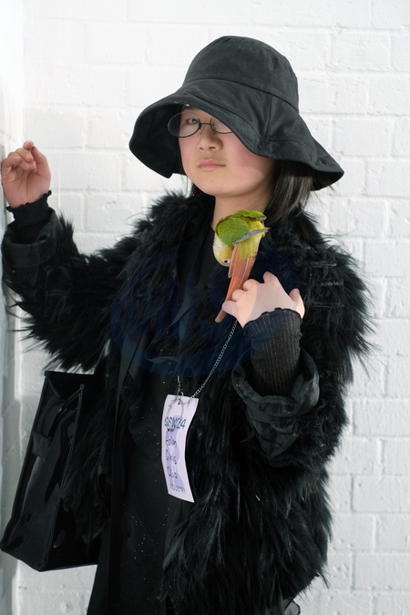 Graduate Fashion Week in London day 4 on 13 June 2024. Image shows a atylish Chinese woman dressed in black with a pet budgie bird, Credit:Pat Lyttle / Avalon