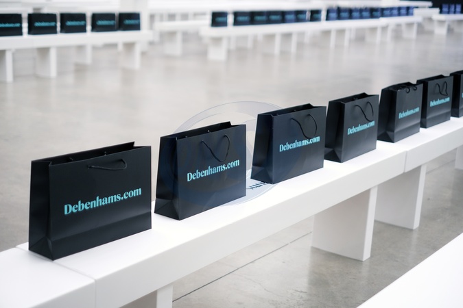 Graduate Fashion Week in London day 4 on 13 June 2024. Image shows a line of goodybags on the front row from show sponsors Debenhams.com, Credit:Pat Lyttle / Avalon