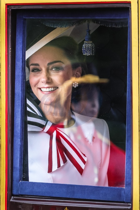 London, UK. 15th June 2024. Catherine, the Princess of Wales rides in a carriage with her children and waves at the crowds. The annual Trooping the Colour ceremonial procession for the King's Birthday makes its way from Buckingham Palace to Horse Guards Parade for proceedings there, and back to the Palace for a balcony appearance. Catherine, the Princess of Wales, is making her first public appearance this year., Credit:Imageplotter / Avalon