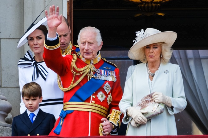 Prince Louis, Catherine, Princess of Wales, King Charles III and Queen Camilla on the palace balcony following Trooping the Colour on Saturday 15 June 2024 at Buckingham Palace, London. Trooping the Colour is a traditional parade held to mark the British Sovereign's official birthday. This year the colours were trooped by The Irish Guards. ., Credit:Julie Edwards / Avalon