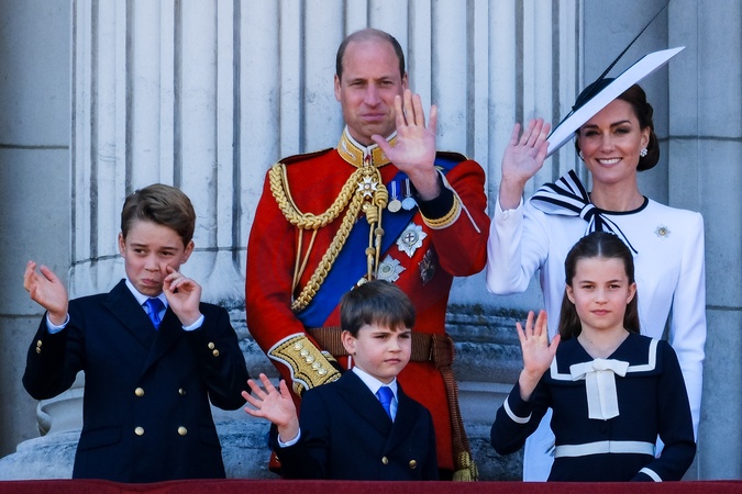 Prince George, Prince Louis, Prince William, Prince of Wales, Catherine, Princess of Wales and Princess Charlotte photographed on the palace balcony following Trooping the Colour on Saturday 15 June 2024 at Buckingham Palace, London. Trooping the Colour is a traditional parade held to mark the British Sovereign's official birthday. This year the colours were trooped by The Irish Guards. ., Credit:Julie Edwards / Avalon