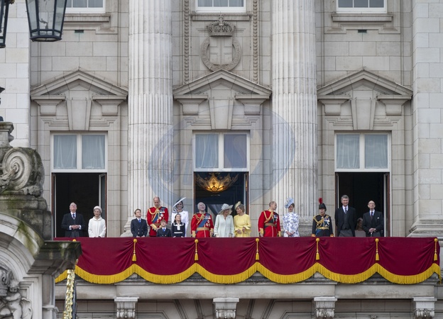 London, UK. 15th June, 2024. In a mix of torrential rain, thunder & lightning, and finally sunshine Trooping the Colour for the King's Official Birthday Parade takes place. in Horse Guards Parade ground with King Charles III taking the salute and No 9 Company Irish Guards trooping the Colour. After the Parade the Royal Family, including Catherine, Princess of Wales, appear on the balcony of Buckingham Palace to wave to the large crowd of wellwishers and spectators who gather outside the Palace spilling onto The Mall. Members of The Royal Family on the balcony of Buckingham Palace. Left to right: Duke & Duchess of Gloucester, Prince George; Prince William, the Prince of Wales; Prince Louis; Catherine, Princess of Wales; Princess Charlotte; King Charles III, Queen Camilla; Duchess of Edinburgh; Duke of Edinburgh; Lady Louise Windsor; Anne; Princess Royal, Credit:MALCOLM PARK / Avalon