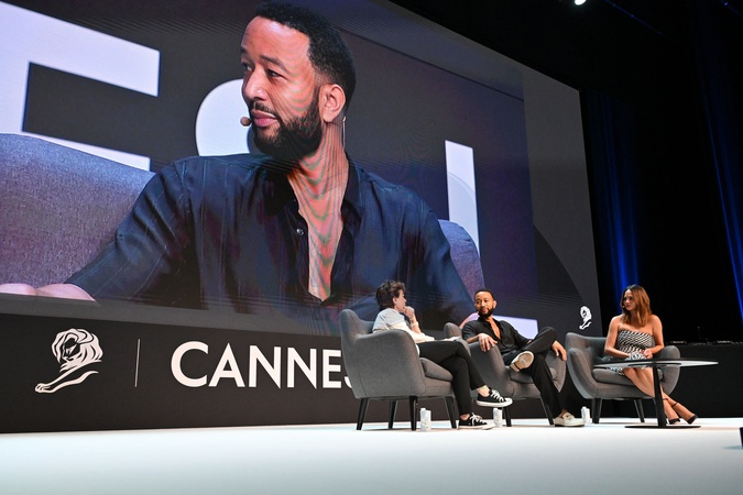John Legend i jego żona Chrissy Teigen biorą udział w konferencji prowadzonej przez Karę Swisher podczas 71. edycji Cannes Lions w Palais des Festivals w Cannes