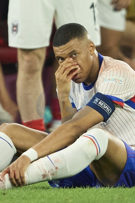- Kylian Mbappé a été victime d'une fracture du nez lors du du match du groupe D de l'Euro 2024 entre l'équipe de France face à l'Autriche (1-0) à Dusseldorf en Allemagne le 17 jun 2024. Sorti avec le nez cassé après un choc avec Kevin Danso, Kylian Mbappé a passé des premiers examens qui laissent place à l'optimisme. L'intervention chirurgicale est écartée « dans l'immédiat », selon la FFF. © Cyril Moreau/Bestimage Kylian Mbappé suffered a broken nose during the Euro 2024 Group D match between France and Austria (1-0) in Dusseldorf, Germany on June 17, 2024. Having left with a broken nose after a collision with Kevin Danso, Kylian Mbappé underwent initial tests that give rise to optimism. Surgery has been ruled out "for the time being," according to the FFF.