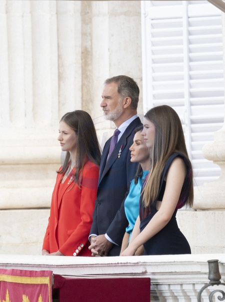 La princesse Leonor, Le roi Felipe VI et la reine Letizia d'Espagne, L'infante Sofia d'Espagne - La famille royale espagnole assiste à la relève de la Garde, à l'occasion du 10ème anniversaire du couronnement du roi d'Espagne au palais royal à Madrid, le 19 juin 2024. © Lalo Yasky / Bestimage King Felipe VI, Queen Letizia, Crownprincess Leonor and Princess Sofia attend the Royal Guard changeover at The Royal Palace in occasion of King Felipe VI Coronation 10th. anniversary celebrations. Madrid. June 19th, 2024.