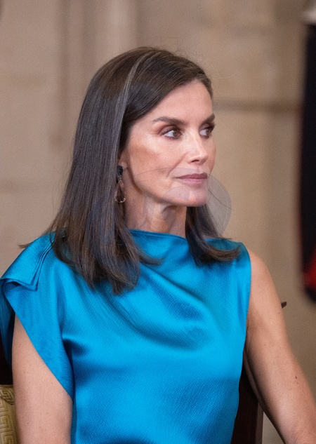 La reine Letizia d'Espagne - La famille royale espagnole préside la cérémonie de décoration des ordres du mérite civil, à l'occasion du 10ème anniversaire du couronnement du roi d'Espagne au palais royal à Madrid, le 19 juin 2024. © Lala Yasky / Bestimage The Decoration Orders of Civil Merit Ceremony at The Royal Palace in occasion of King Felipe VI Coronation 10th Anniversary celebrations. Madrid. June 19th, 2024.