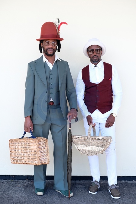 Stylish attendees on Ladies Day at Royal Ascot, Thursday 20 June 2024. Traditionally hats and fascinators are worn, but this image shows a more overall fashion look and its key points. Image shows two dapper gaus in a dandy style, Credit:Pat Lyttle / Avalon