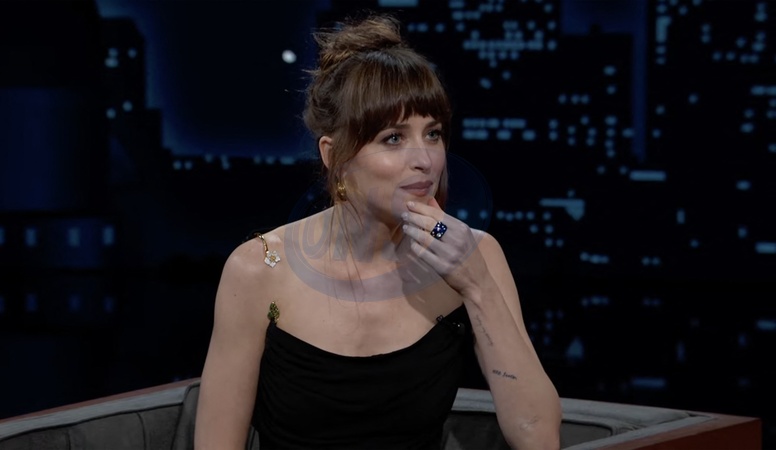 Pictures must credit: ABC Fifty Shades of Grey movie star Dakota Johnson suffered a clothes malfunction on a TV talk show — before revealing how she helped choose a photo of a penis for her latest movie. Dakota, 34, the daughter of Miami Vice TV actor Don Johnson, was on Jimmy Kimmel Live in the USA to promote her latest film, Daddio, which co-stars Sean Penn. But before she could discuss it after a brief clip was shown, the camera panned back to reveal a should clip of her black evening gown had broke, And she was forced to cling on to part of it to keep her modesty. Kimmel ,56, asked Dakota, who is dating Coldplay rock singer Chris Martin :”Should I get some Scotch tape ?” She replied: "it seems to be hanging in all right.” She jokily placed both her her hands over her breasts Kimmel, who lives next door to Dakota in real life, commented: "Yeah, just hold the important part and there you go !” Daddio features just Johnson as a cab passenger and Penn as the taxi driver. She is taking a cab ride from New York's JFK airport and engages in a conversation with Penn's character about the important relationships in their lives. The whole film is set in the vehicle. Picture supplied by JLPPA
