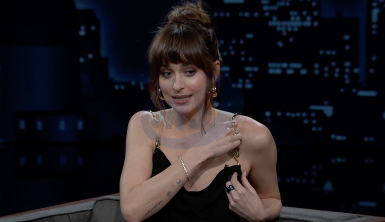 Pictures must credit: ABC Fifty Shades of Grey movie star Dakota Johnson suffered a clothes malfunction on a TV talk show — before revealing how she helped choose a photo of a penis for her latest movie. Dakota, 34, the daughter of Miami Vice TV actor Don Johnson, was on Jimmy Kimmel Live in the USA to promote her latest film, Daddio, which co-stars Sean Penn. But before she could discuss it after a brief clip was shown, the camera panned back to reveal a should clip of her black evening gown had broke, And she was forced to cling on to part of it to keep her modesty. Kimmel ,56, asked Dakota, who is dating Coldplay rock singer Chris Martin :”Should I get some Scotch tape ?” She replied: "it seems to be hanging in all right.” She jokily placed both her her hands over her breasts Kimmel, who lives next door to Dakota in real life, commented: "Yeah, just hold the important part and there you go !” Daddio features just Johnson as a cab passenger and Penn as the taxi driver. She is taking a cab ride from New York's JFK airport and engages in a conversation with Penn's character about the important relationships in their lives. The whole film is set in the vehicle. Picture supplied by JLPPA
