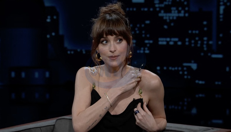 Pictures must credit: ABC Fifty Shades of Grey movie star Dakota Johnson suffered a clothes malfunction on a TV talk show — before revealing how she helped choose a photo of a penis for her latest movie. Dakota, 34, the daughter of Miami Vice TV actor Don Johnson, was on Jimmy Kimmel Live in the USA to promote her latest film, Daddio, which co-stars Sean Penn. But before she could discuss it after a brief clip was shown, the camera panned back to reveal a should clip of her black evening gown had broke, And she was forced to cling on to part of it to keep her modesty. Kimmel ,56, asked Dakota, who is dating Coldplay rock singer Chris Martin :”Should I get some Scotch tape ?” She replied: "it seems to be hanging in all right.” She jokily placed both her her hands over her breasts Kimmel, who lives next door to Dakota in real life, commented: "Yeah, just hold the important part and there you go !” Daddio features just Johnson as a cab passenger and Penn as the taxi driver. She is taking a cab ride from New York's JFK airport and engages in a conversation with Penn's character about the important relationships in their lives. The whole film is set in the vehicle. Picture supplied by JLPPA