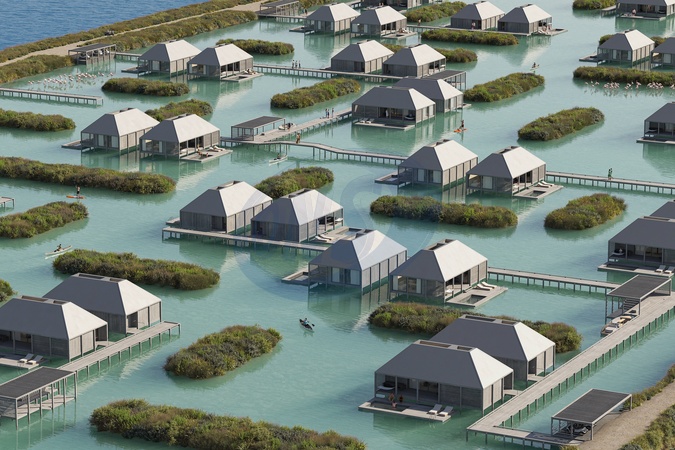 Pictures must credit: MAST A plan to turn a lagoon into a hotel concept with a cluster of chalets on stilts has been unveiled. The lagoon in Portugal, known as salina, was used for salt production dating back at least three hundred years. It was abandoned in the early 2000´s and has since become overgrown. The channels and ponds which wind around the 50 hectare site have since become breeding grounds for shrimp which attract flocks of flamingos and oystercatchers. Danish architecture company MAST has designed timber houses on stilts. The cabins were inspired by the traditional fisherman's huts and jetties which dot the lagoons and rivers of Southern Portugal. The cabins are accessible by foot using winding, elevated walkways or by boat or kayak and are being prefabricated off site reducing the impact of the construction on the delicate landscape. The dilapidated salt production building still on site will become a restaurant and spa. There will also be a new cluster of agricultural buildings inspired by traditional Portuguese wooden salt storage warehouses. Picture supplied by JLPPA