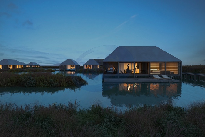 Pictures must credit: MAST A plan to turn a lagoon into a hotel concept with a cluster of chalets on stilts has been unveiled. The lagoon in Portugal, known as salina, was used for salt production dating back at least three hundred years. It was abandoned in the early 2000´s and has since become overgrown. The channels and ponds which wind around the 50 hectare site have since become breeding grounds for shrimp which attract flocks of flamingos and oystercatchers. Danish architecture company MAST has designed timber houses on stilts. The cabins were inspired by the traditional fisherman's huts and jetties which dot the lagoons and rivers of Southern Portugal. The cabins are accessible by foot using winding, elevated walkways or by boat or kayak and are being prefabricated off site reducing the impact of the construction on the delicate landscape. The dilapidated salt production building still on site will become a restaurant and spa. There will also be a new cluster of agricultural buildings inspired by traditional Portuguese wooden salt storage warehouses. Picture supplied by JLPPA