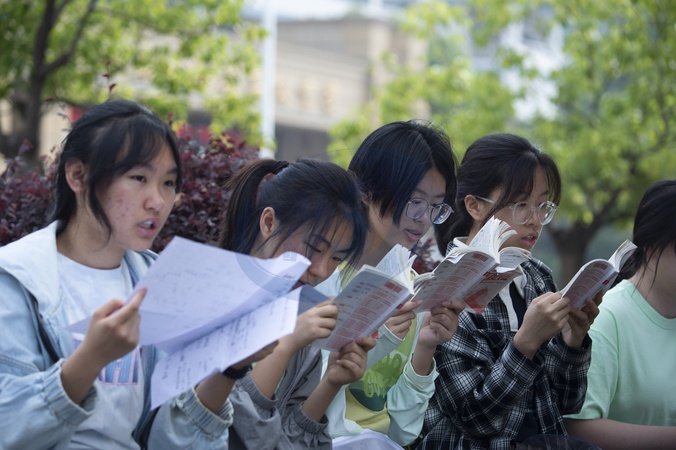 Students review their exam preparation materials in the last minutes before the National College Entrance Exam, or Gaokao, outside an exam venue in Hai'an city in east China's Jiangsu province Friday, June 07, 2024., Credit:XU JINBAI / Avalon