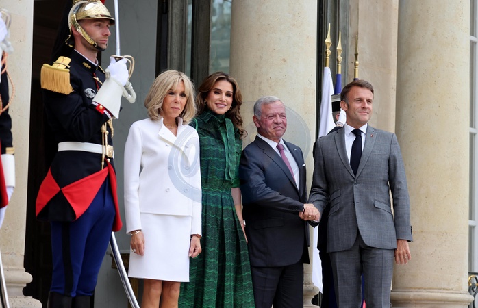 Le Président de la République française, Emmanuel Macron et la première dame Brigitte Macron reçoivent le Roi Abdallah II de Jordanie et la Reine Rania, pour un déjeuner de travail au Palais de l'Elysée à Paris, le 24 juin 2024. © Dominique Jacovides / Bestimage The President of the French Republic, Emmanuel Macron and the first lady Brigitte Macron receive King Abdullah II of Jordan and Queen Rania, for a working lunch at the Elysée Palace in Paris, June 24, 2024.