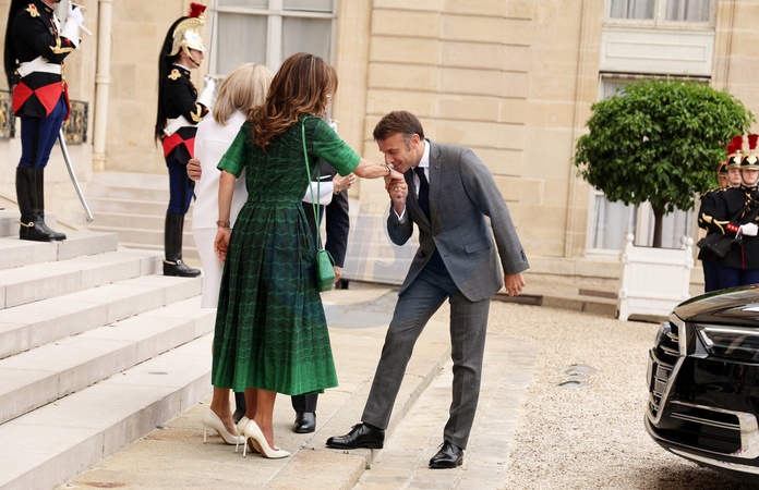 Prezydent Republiki Francuskiej Emmanuel Macron i pierwsza dama Brigitte Macron przyjmują króla Jordanii Abdullaha II i królową Ranię na roboczym obiedzie w Pałacu Elizejskim w Paryżu