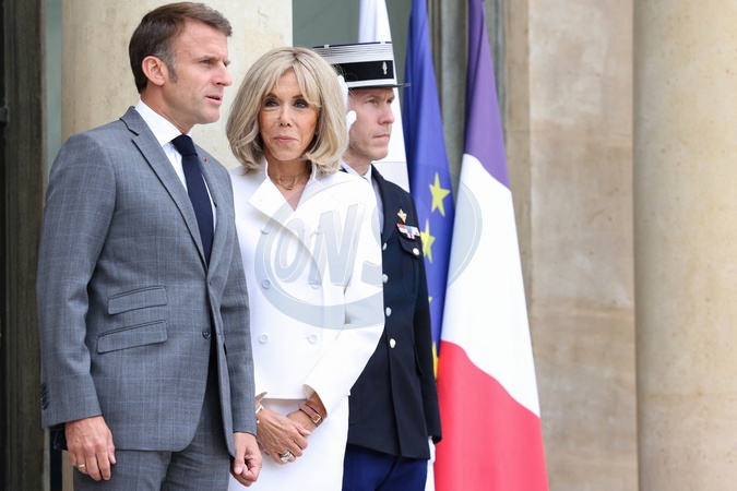Le Président de la République française, Emmanuel Macron et la première dame Brigitte Macron reçoivent le Roi Abdallah II de Jordanie et la Reine Rania, pour un déjeuner de travail au Palais de l'Elysée à Paris, le 24 juin 2024. © Stéphane Lemouton / Bestimage The President of the French Republic, Emmanuel Macron and the first lady Brigitte Macron receive King Abdullah II of Jordan and Queen Rania, for a working lunch at the Elysée Palace in Paris, June 24, 2024.