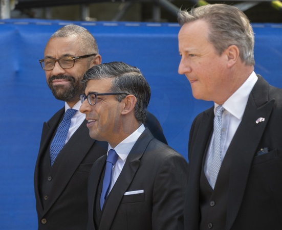 Horse Guards Parade, London, UK. 25th June 2024. Ceremonial welcome of Japanese Emperor Naruhito and Empress Masako on their State Visit to the UK. They are accompanied to the Royal Pavilion on Horse Guards by His Royal Highness The Prince of Wales. After the Guard of Honour give the Royal Salute and play the Japanese National Anthem, the Emperor and King Charles III inspect the Guard of Honour from the 1st Battalion Welsh Guards with the Band of the Welsh Guards. The Emperor and Empress then join The King and Queen, and The Prince of Wales, in a carriage procession along The Mall to Buckingham Palace. Image: James Cleverly, Rishi Sunak and Lord Cameron leave Downing Street to attend the ceremony in Horse Guards, Credit:MALCOLM PARK / Avalon