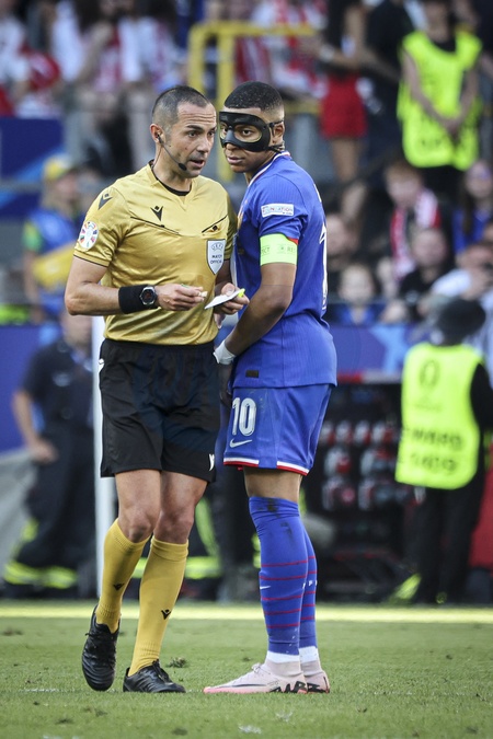 10 Mbappe Lottin Kylian MBAPPE Forward (FRA) et arbitre du match France - Pologne Marco Guida - Match de l'Euro 2024 opposant la France à la Pologne (1-1) à Dortmund le 25 juin 2024. Euro 2024 match between France and Poland (1-1) in Dortmund on 25th june 2024.